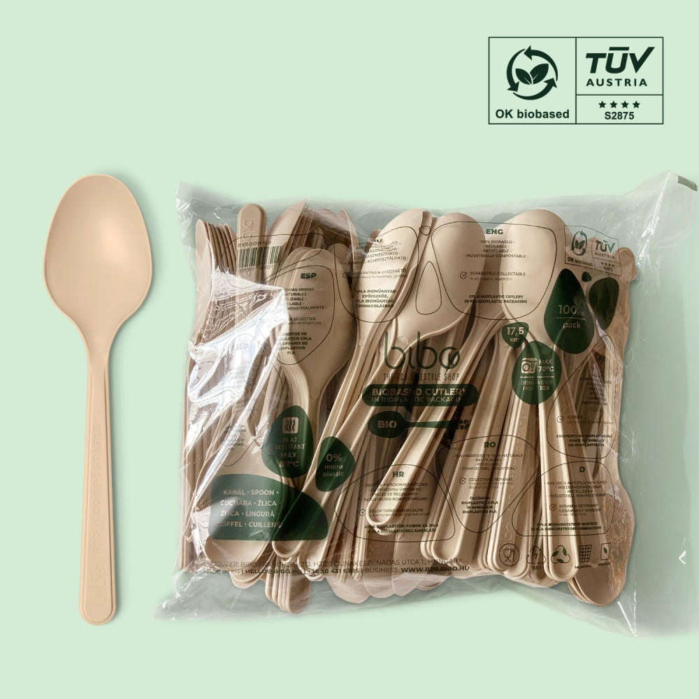 Egyrészt megújuló, növényi erőforrásból készülnek (kis CO2 lábnyom), amelyet a TÜV Austria is tanúsított ("OK Biobased" tanúsítvánnyal rendelkezünk), másrészt pedig biológiai úton lebonthatóak (iparilag komposztálható), és a bomlás során természetes anyagokra bomlik. Növelt hőállóságuk a fejlesztéseink eredményeképpen 80°C, így forró ételek is fogyaszthatóak vele az evőeszköz lehajlása nélkül. Továbbá 70°C-ig mosogatógépben is moshatóak, így többször használhatóak. A bioműanyag alapanyag tanúsítottan PFAS (örök vegyszer), BPA (biszfenol-A) és ftalátmentes.