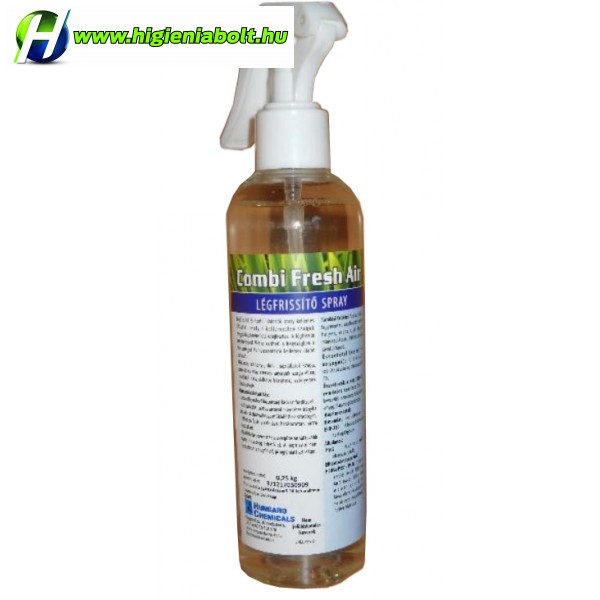 Combi Fresh Air légfrissítő és textil illatosító spray kellemes illattal, mely a kellemetlen szagok megszüntetésére lett kifejlesztve. Mosdók, irodák, egyéb helyiségekben alkalmas dohány-, doh-, háziállatok szaga, szemét és más szerves anyagok szaga ellen, továbbá használható kárpitok, szőnyegek frissítésére is.