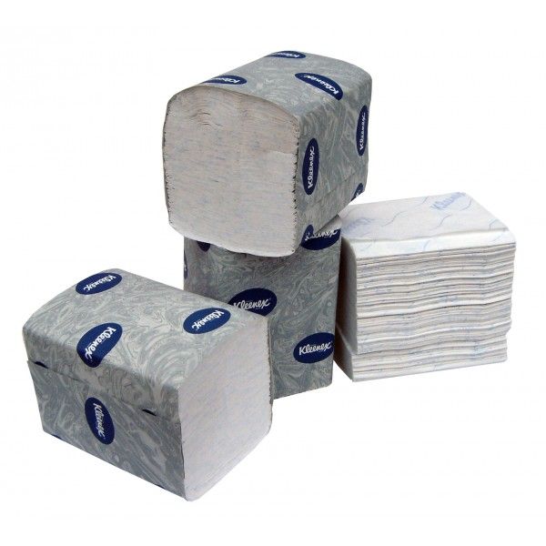 Kimberly Clark hajtogatott toalettpapír , 2 rétegű cellulóz kivitel , kék színű " kleenex " felirattal .